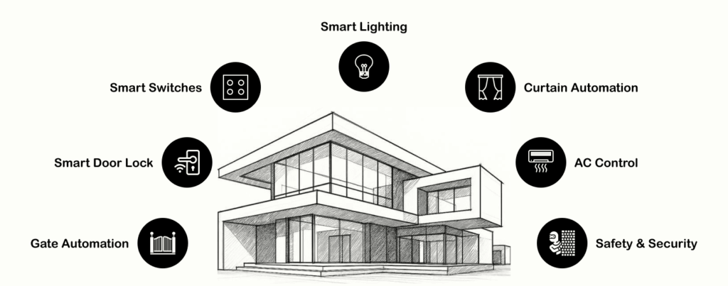 Complete Home Automation in Bengaluru. From lighting, music, switches, curtains, to security—control, your entire world with one touch, or no touch at all.